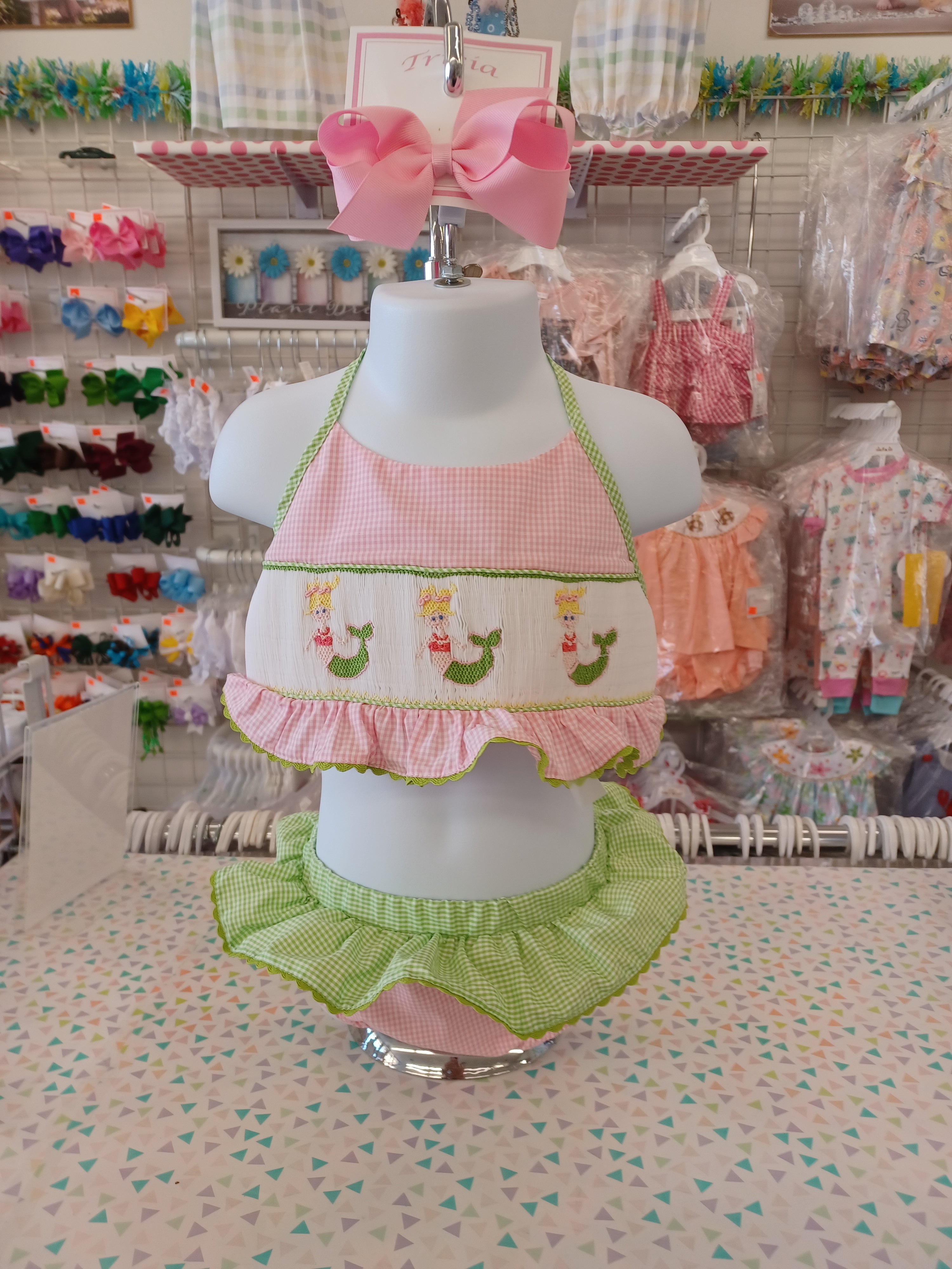 Girls Hand Smocked 2pc Pink Mermaid Swimsuit