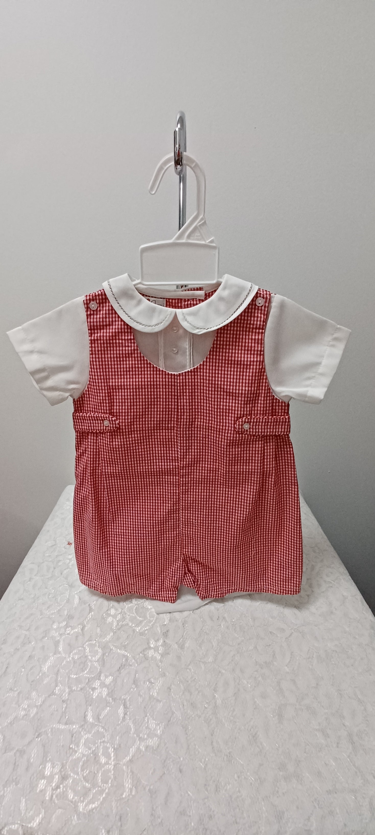 Boys Red Gingham Shortall With Matching Hat